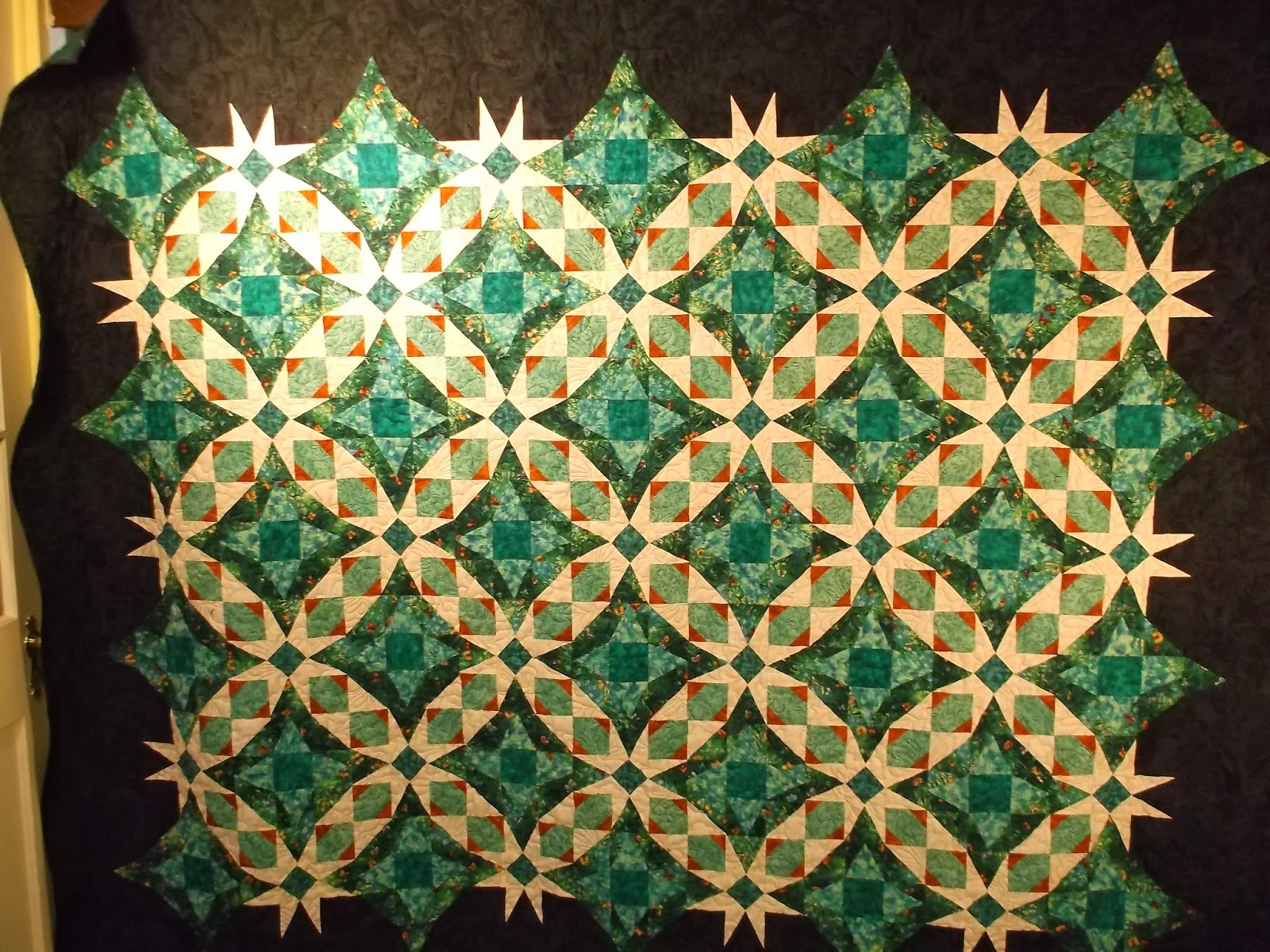 I don't know the actual name of this quilt, but "For the love of Teal" is what Helen called it when she dropped it off for quilting. The quilting doesn't show since we matched the thread color to the color in the quilt, but trust me, it's lovely.